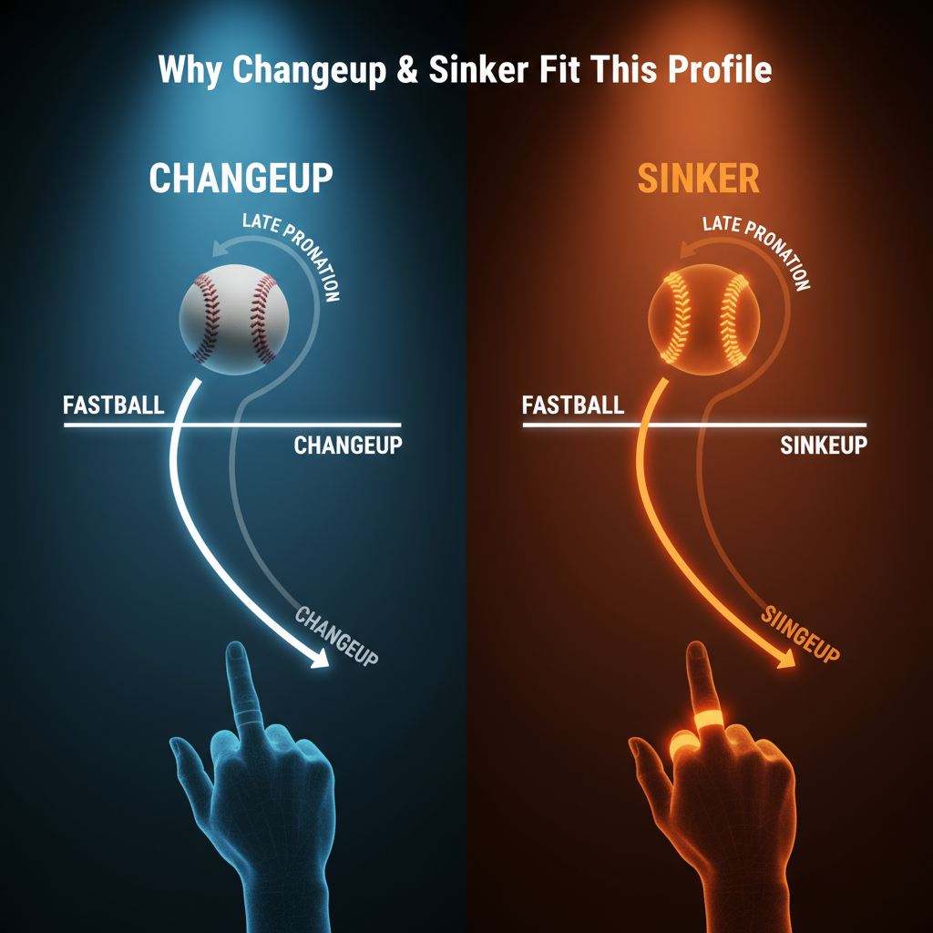 - Supinator preference → ideal for pitches that rely on arm-side run and late pronation (changeup, sinker).